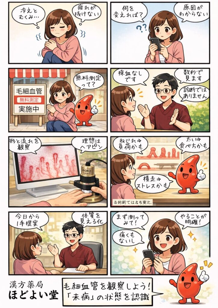 採血なし・短時間で、毛細血管の“形と流れ”を観察し、あなたの体質(中医学)と生活習慣(栄養・腸活)をセットで整える提案をします。