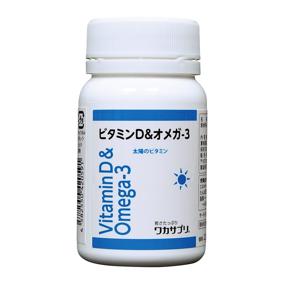 ワカサプリ ビタミンD&オメガ3は、1粒あたりD3 25µg(1,000IU)+サーモンオイル200mg(EPA・DHA含有)を配合。D3はCa吸収・骨/筋・免疫に、オメガ3はエイコサノイドバランスや巡りに配慮。国内GMPで製造し、ノルウェー産サーモン油を日本で精製、賦形は最小限のシンプル処方。1日1粒を食後に、Ca・亜鉛・プロ/プレバイオと併用で粘膜バリアのトータルケアに。
